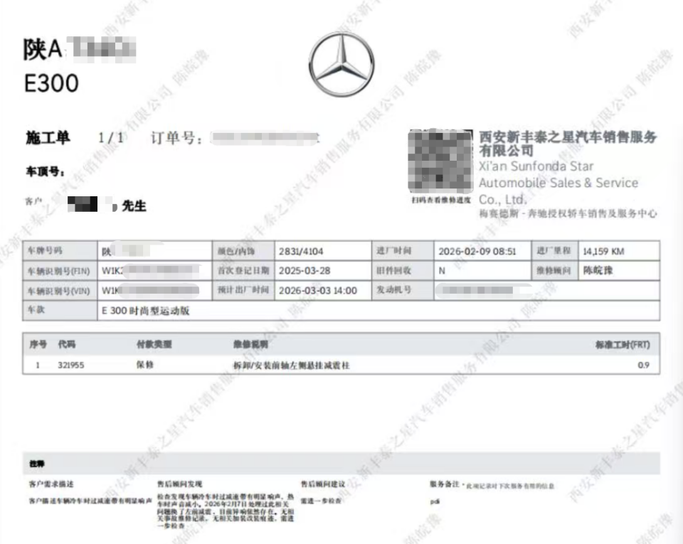对于此次维修结果,新丰泰之星奔驰4S店的工作人员表示,经过颠簸路面时车辆减震系统发生响动属于正常现象,而非“异响”。根据相关标准,目前车辆已经维修合格,可以正常上路行驶。