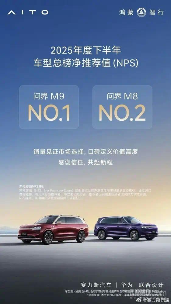 CNMO注意到,问界M8自2025年4月上市以来,凭借精准的家庭用户定位与华为全栈技术赋能,其累计交付量已突破16万台,稳居40万级销量标杆。在口碑层面,问界M8同样表现亮眼。根据杰兰路发布的《2025年度下半年新能源汽车品牌健康度研究》报告,问界M8首次参评即位列净推荐值(NPS)第二。